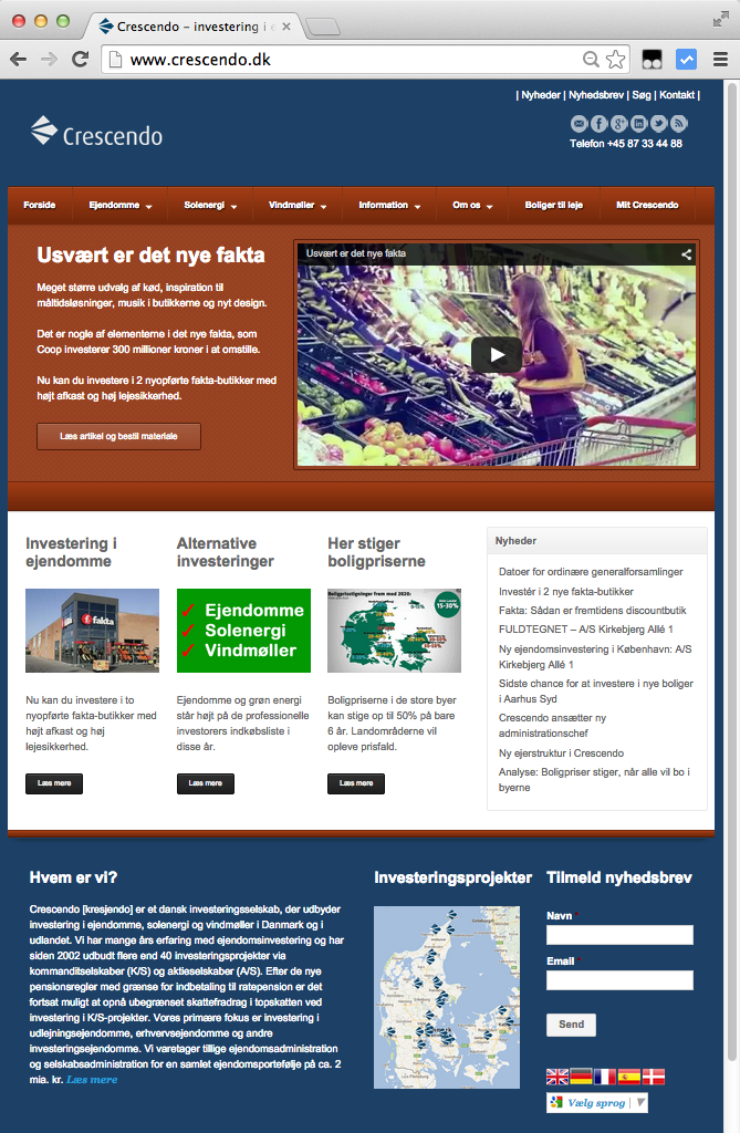 Jeg har i 2012 og igen i 2020 bygget crescendo.dk i WordPress ud fra en skabelon med responsivt design. Layout er tilpasset eksisterende printlayout og der er integreret kortvisning af alle virksomhedens ejendomsprojekter. Jeg har endvidere udarbejdet søstersite til brug for boligudlejning samt mikrosites til brug for nye ejendomsprojekter.