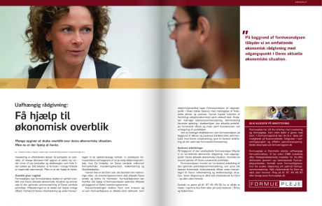 Da en af Formueplejes vigtige målgrupper er revisorer (som rådgiver formuende personer), valgte vi at indrykke en række ”artikler” i fagblade som Revision & Regnskabsvæsen, Advokaten, Lederne mv. Artiklerne skulle ikke sælge Formueplejes produkter eller ydelser, men give læseren viden og indsigt – og dermed indirekte påvirkning.